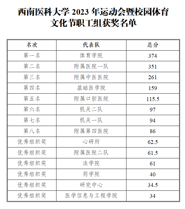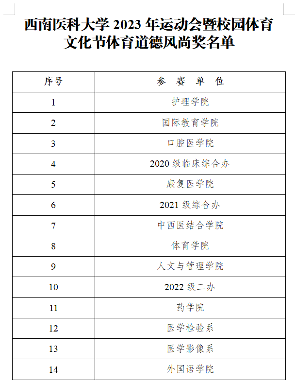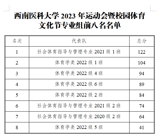 4月19—21日,西南医科大学2023年运动会暨校园体育文化节在奥林匹克体育中心和青年体育中心举办。本次运动会由篮球、网球、田径等16个项目组成,全校师生共计3382名运动员参与其中。此前,3月18日至4月17日,主要开展了足球、篮球、排球、羽毛球、乒乓球、网球、毽球和校园定向越野等15个项目的比赛。