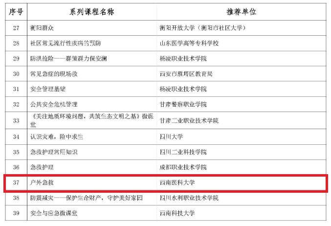 我校基础医学院孙国刚教授带领的国家级一流课程(急救整合与创新科普)团队按照通知要求,认真组织了本次特色课程和经典案例的申报,并以户外急救为主题,拍摄录制了20多个以户外急救相关的微课,还对每个微课进行详细的注解和说明。经校内专家评审、学校和四川省教育厅推荐,最终由汤华军副教授作为课程负责人申报的 《户外急救》 获得教育部首批社区教育“能者为师”特色课程。