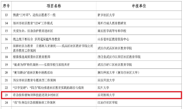 近日,教育部现公布了首批社区教育“能者为师”系列特色课程和“能者为师”典型案例名单,我校申报的《户外急救》 课程获评为教育部首批社区教育“能者为师”特色课程,《将急救科普知识和技能送到乡村社区》获评为经典案例。