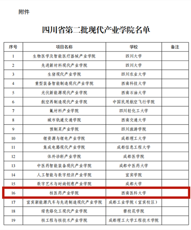 近日,四川省教育厅公布了,第二批省级现代产业学院名单,西南医科大学申报的核医药产业学院成功立项。