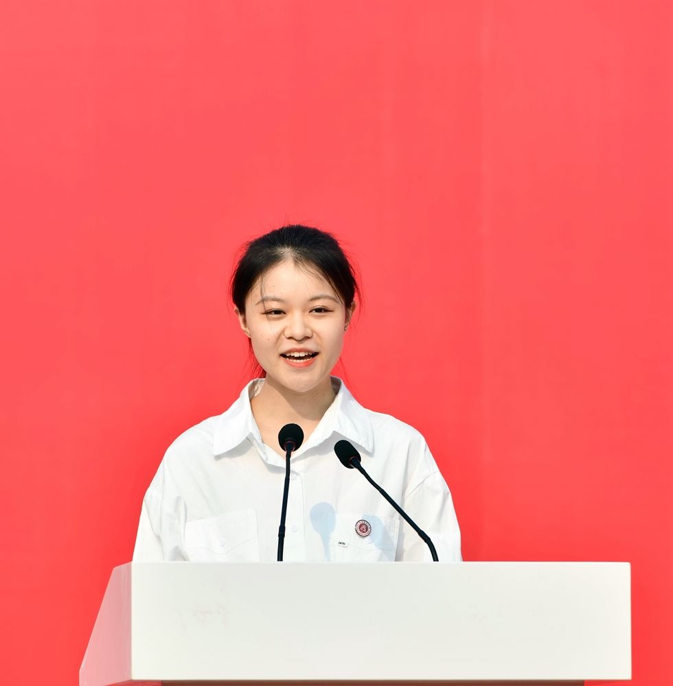 药学院临床药学专业郭甜甜和法学专业硕士车昭宜分别作为本科和研究生新生代表发言。她们表示,作为新时代的大学生,自当把爱国热血融入实践,促进自强魂与强国魂相互融合,铸就不悔青春;要带着一股韧劲去面对接下来的每一个挑战,制定一个可行而又坚定的目标,积极进取、认真刻苦地去学习专业知识、挖掘专业深度。
