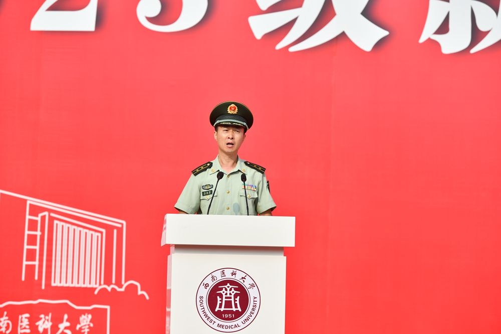 承训部队,武警泸州支队副支队长毛永明发言。他要求同学们要正确认识军训,保持坚忍毅力刻苦认真训练,开拓永不言弃的精神高地;服从严格自身要求,培养令行禁止的优良作风;致力精诚团结,加强互帮互助,打造坚强有力的和谐集体。