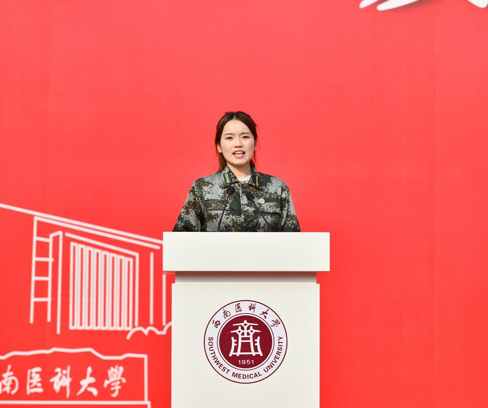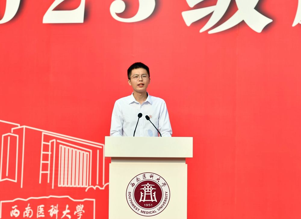 人文与管理学院公共事业管理专业李欢作为在校生代表发言。他从“思在医大,当求真理,汲取‘精神钙’;学在医大,当求学问,练就‘真本领’;行在医大,当求实践,砥砺‘新担当’”三个方面分享了自己的所感所悟,祝福各位新生在西南医大有所获、有所成,与时代、与医大一起成长。