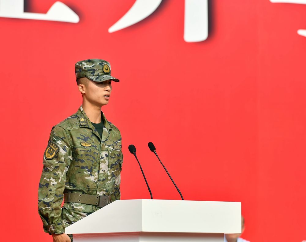教官代表吕青云发言。他表示,军训工作已经拉开帷幕,自己将坚守军人本色,以良好的军人形象引领大家;认真履行教官职责,做好同学们的榜样;严格按照军训计划,科学施训、灵活组训。