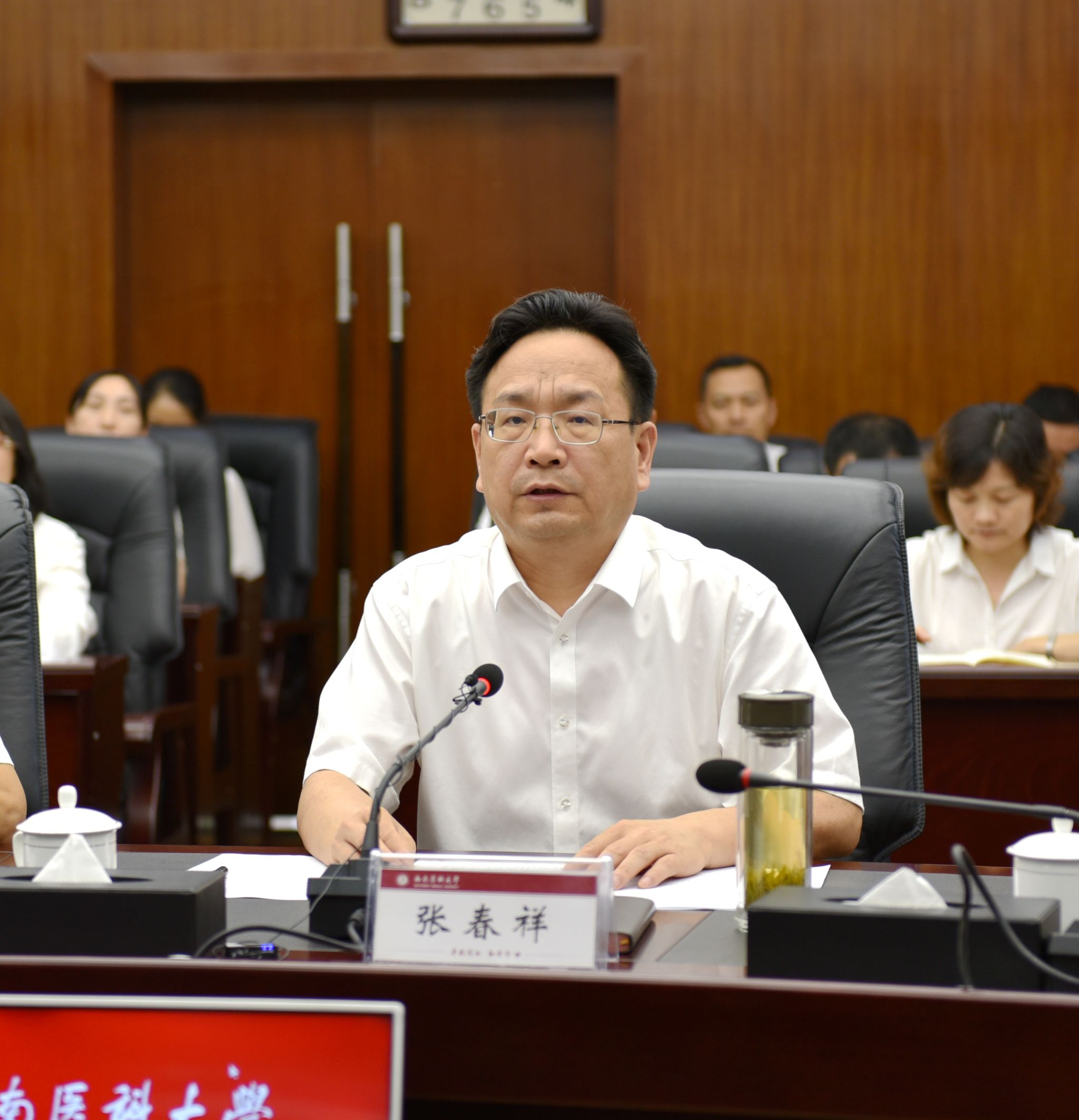 校党委副书记、校长张春祥致辞。他对出席会议的各位领导、专家表示了诚挚的欢迎和衷心的感谢。他表示,新一轮审核评估是贯彻落实习近平总书记关于教育的重要论述和全国教育大会精神,全面对接新时代教育评价、教育督导体制机制改革要求,引导督促高校遵循高等教育规律和本科人才培养规律,聚焦本科教育教学质量全面提升的重要手段,是对我校的本科教育教学工作的又一次全面检验,必将对学校事业发展产生深远的影响。学校上下高度重视新一轮审核评估工作,将以积极主动的态度、认真负责的精神、实事求是的作风,全力以赴配合专家组的工作,虚心接受各位专家的指导和批评,确保圆满完成新一轮审核评估各项工作,并将以此次审核评估为契机,加快建设特色鲜明的西部高水平医科大学,努力实现学校第二次党代会提出的“138”发展战略,更好地“为党育人,为国育才”。
