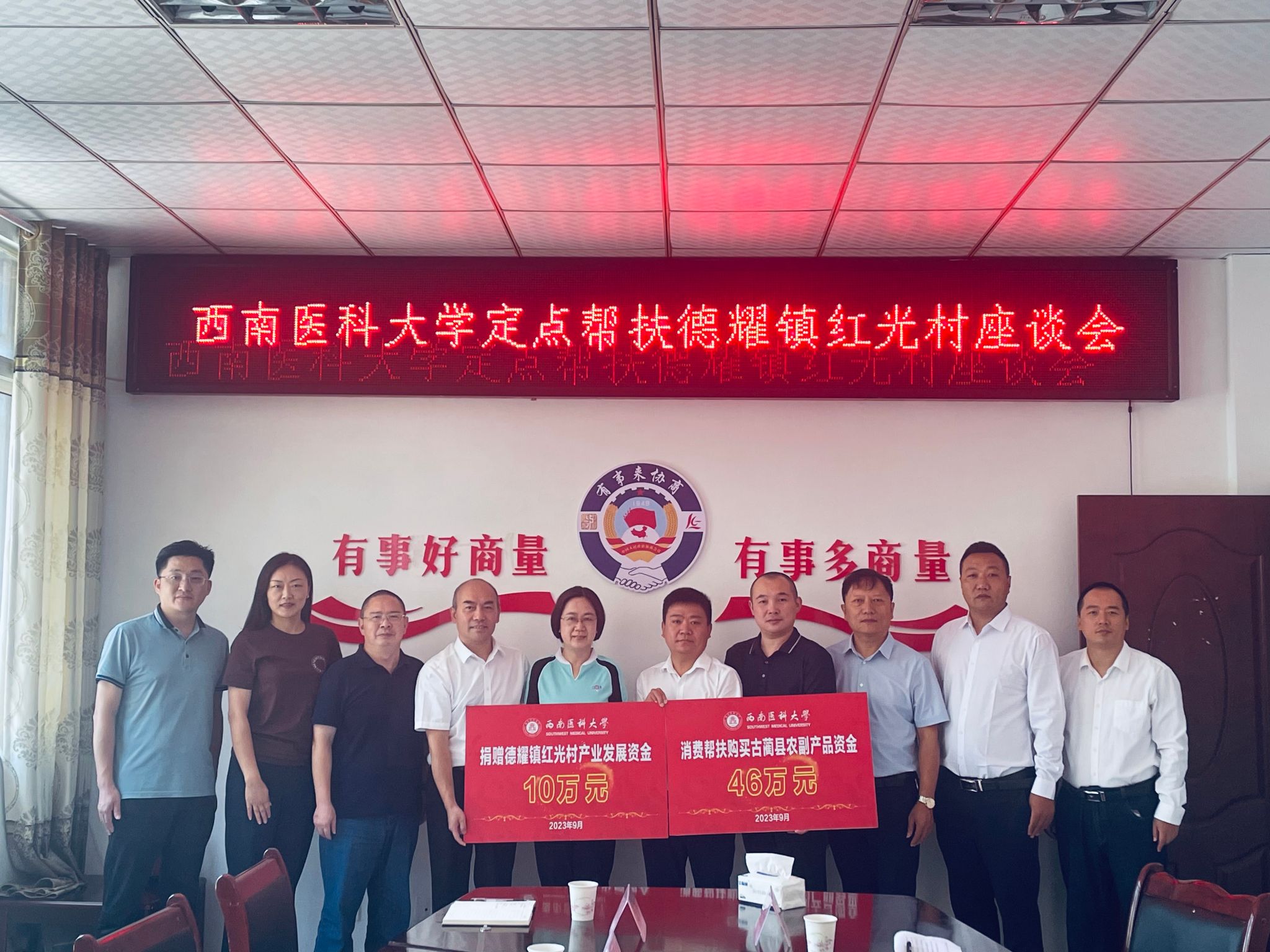 会议还举行捐赠仪式,刘毅代表学校向红光村捐赠46万元的消费帮扶资金和10万元的产业发展资金。会后,刘毅一行实地考察冷水鱼养殖项目、“牛皮茶”加工厂等。