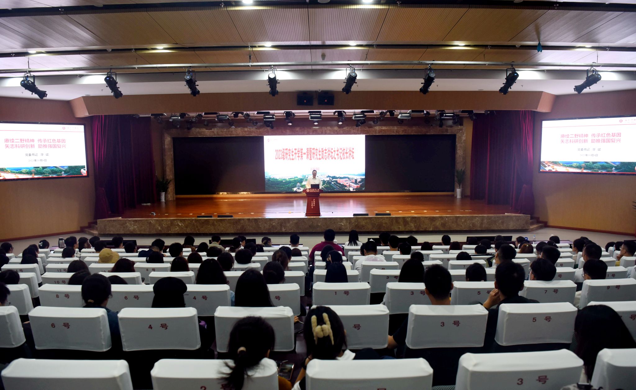 2023年10月8日晚,学校举行2023级研究生励志讲坛之书记校长讲坛。学校党委书记廖斌以《赓续二野精神 传承红色基因 矢志科研创新 助推强国复兴》为题为研究生新生讲授“开学第一课”。