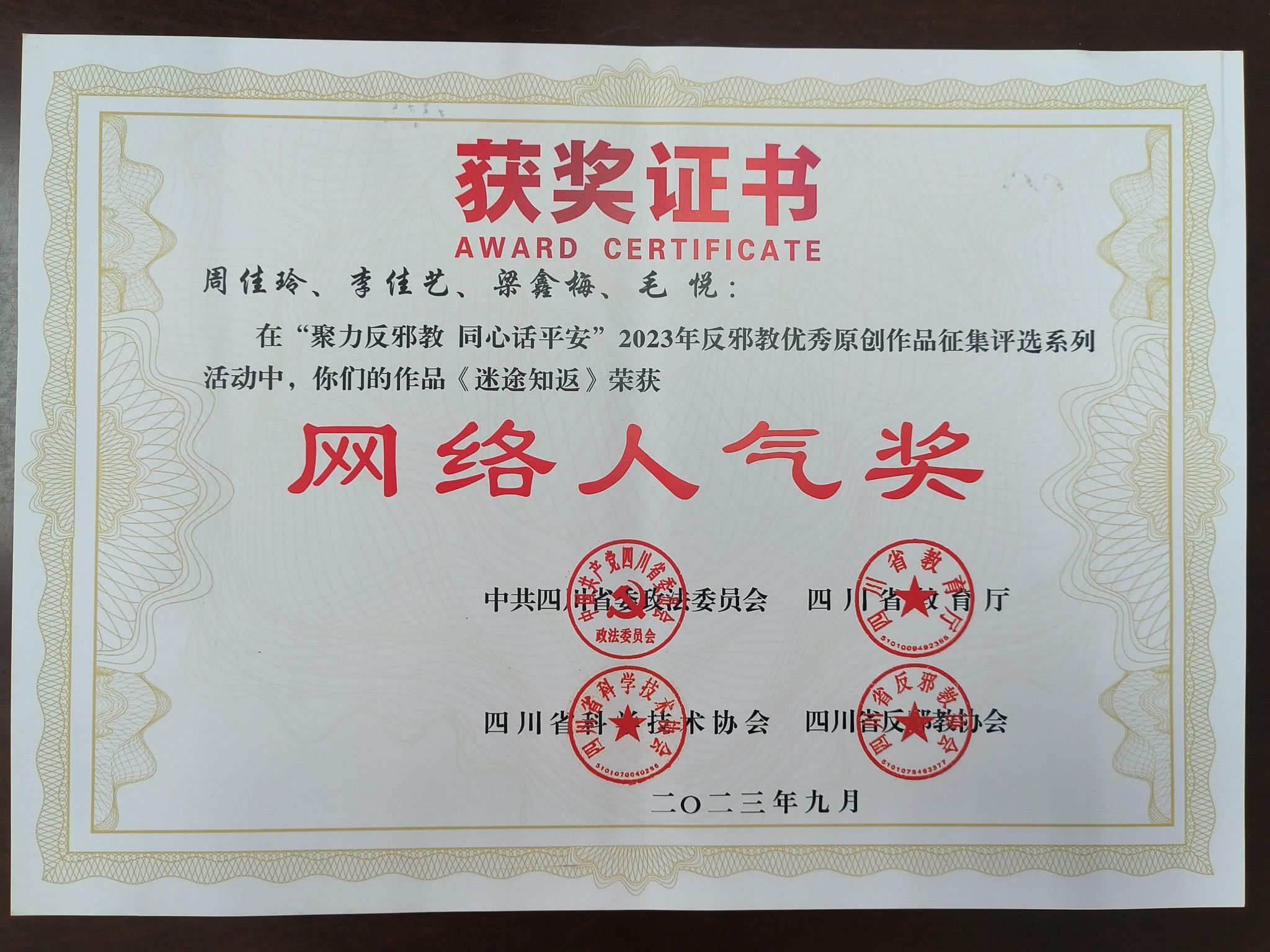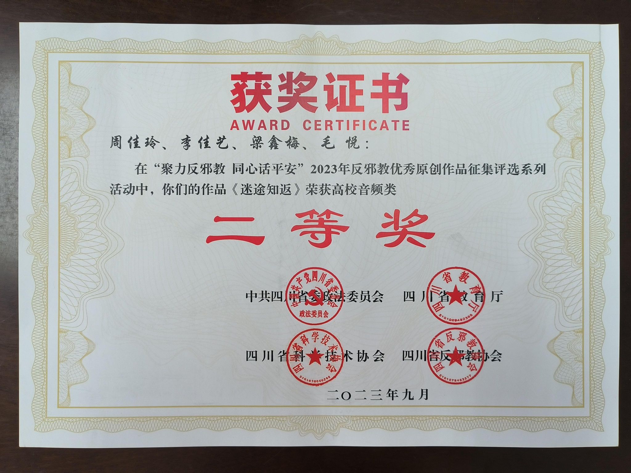 近日,由四川省政法委、省教育厅、省科学技术协会、省反邪教协会等单位联合开展的“聚力反邪教 同心话平安”2023年反邪教优秀原创作品征集评选活动圆满收官,由我校武装部·保卫部(处)何龙指导,人文与管理学院学生李佳艺、梁鑫梅,护理学院学生毛悦、周佳玲共同创作的作品《迷途知返》荣获高校音频类二等奖和网络人气奖。