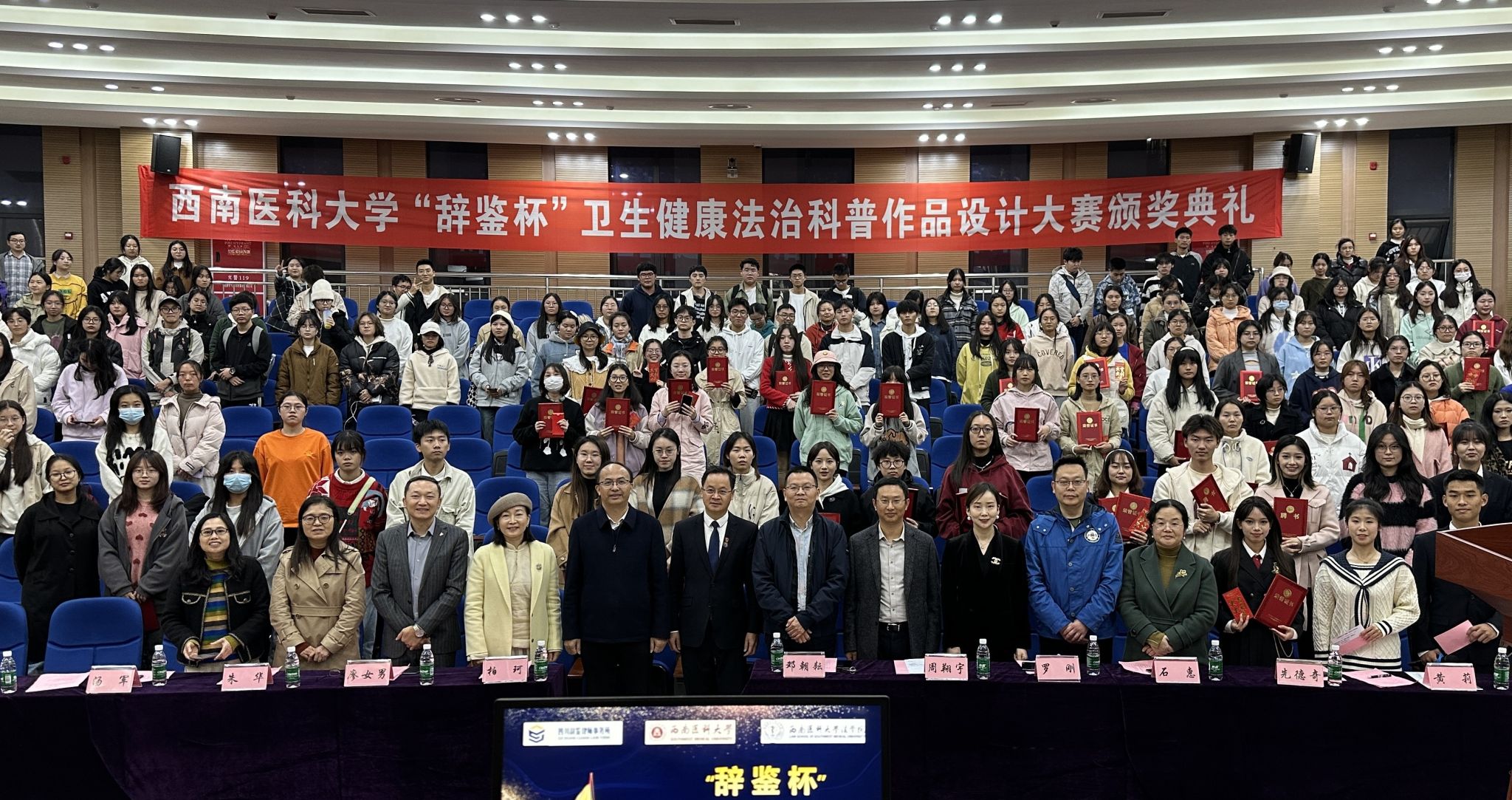 11月13日晚,“辞鉴杯”卫生健康法治科普作品设计大赛颁奖典礼在我校模拟法庭举行。本次活动由西南医科大学主办,四川辞鉴律师事务所与西南医科大学法学院承办。四川辞鉴律师事务所执行主任邓朝耘、执行副主任朱华,西南医科大学党委常委、宣传统战部部长柏珂,科技处处长周翔宇,团委书记石惠,教务处副处长汤军以及法学院党政领导、师生代表出席颁奖典礼。颁奖典礼由法学专业2023级学生张喻斌、汪靓洁主持。