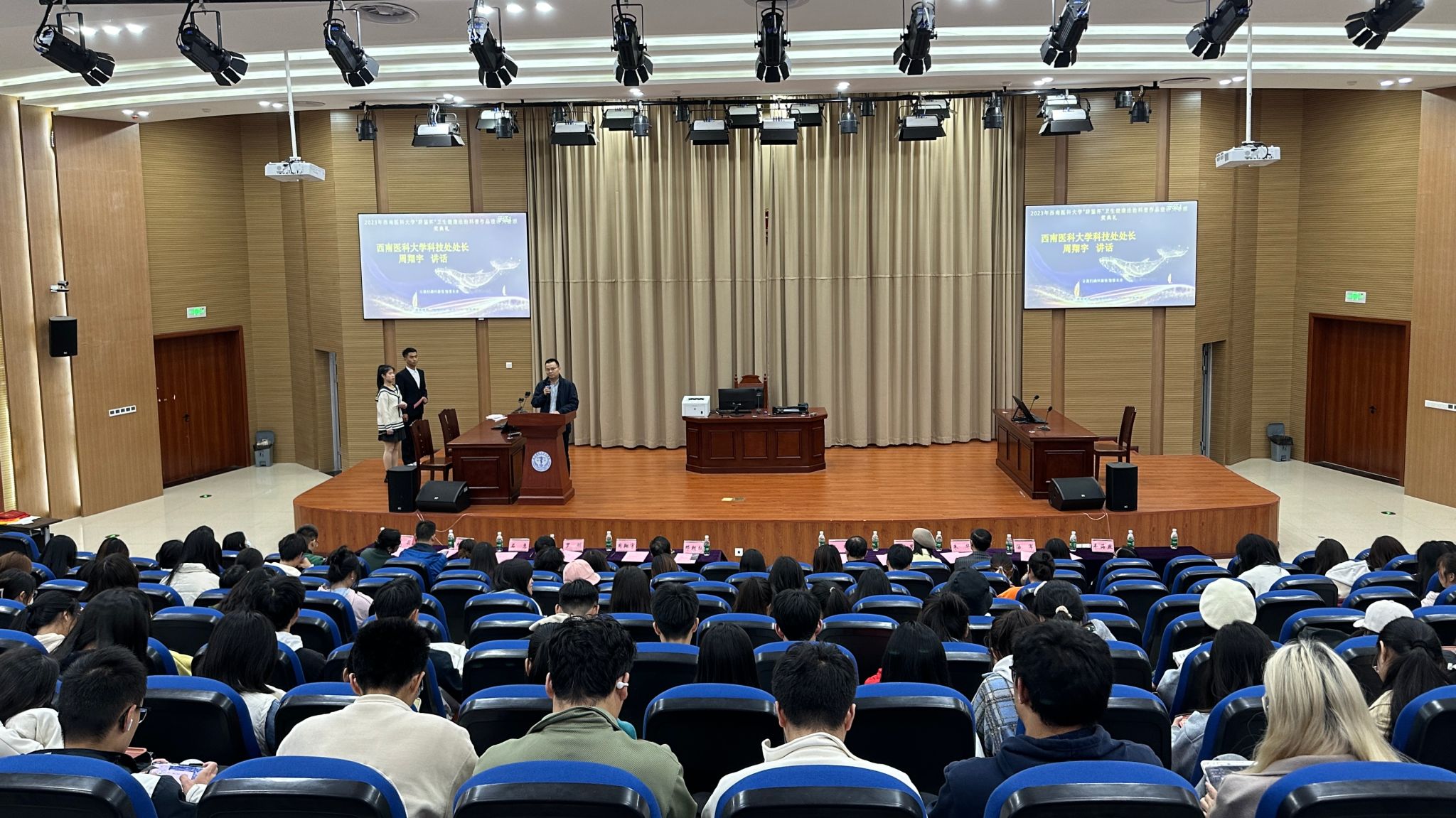 周翔宇在讲话指出,多年来我校积极组织形式多样的科技、文化、艺术活动,大大提升了校园文化品位,着力打造校园文化品牌,有力推进科研育人、文化育人、实践育人,并取得显著成绩。他对广大学子提出三点要求:一是要立足校园、放眼社会,积极培养其创新精神、陶冶高尚情操、提升综合素质,为投身社会主义现代化建设打下扎实基础;二是要把卫生健康法治建设与群众关心的热点难点问题结合起来,回应社会关切,切实爱科学、学科学、讲科学;三是要坚持法治宣传教育与法治实践相结合,助力卫生健康法律法规落地见效,不断为文明法治作出贡献。