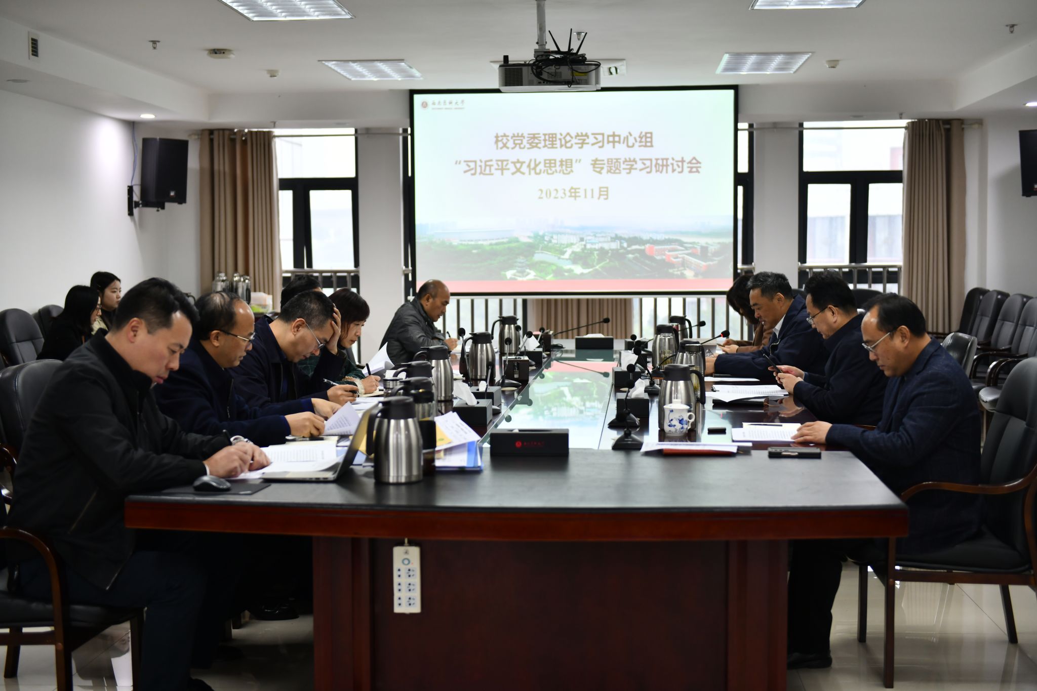 11月14日上午,校党委理论学习中心组在城北校区德诚楼621会议室召开“习近平文化思想”专题学习研讨会。全体校党委理论学习中心组成员、党政办公室主任参加会议。校党委书记、中心组组长廖斌主持会议。
