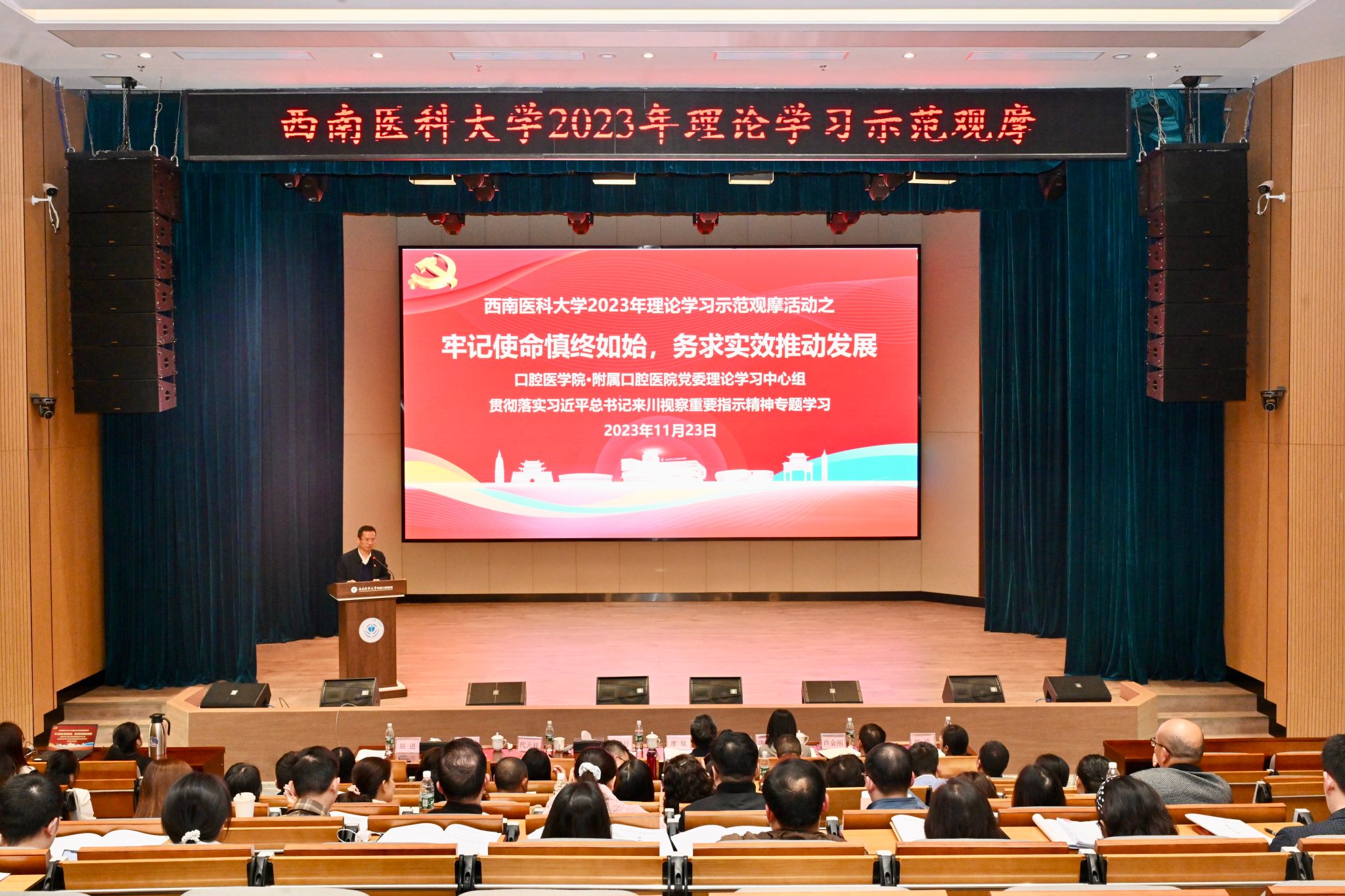 为深入学习贯彻习近平总书记来川视察重要指示精神,11月23日,学校2023年理论学习示范观摩活动在附属口腔医院云峰路院本部五楼学术报告厅举行。本次活动以“牢记使命慎终如始,务求实效推动发展——贯彻落实习近平总书记来川视察重要指示精神专题学习”为主题,由口腔医学院·附属口腔医院党委理论学习中心组作示范学习。学校党委书记廖斌,党委宣传部·统战部副部长唐开秀以及各二级党组织负责人出席观摩活动;口腔医学院·附属口腔医院党委理论学习中心组成员,党支部书记、职能部门主要负责人参加专题学习。会议由学校口腔医学院·附属口腔医院党委书记、中心组组长代天祥主持。