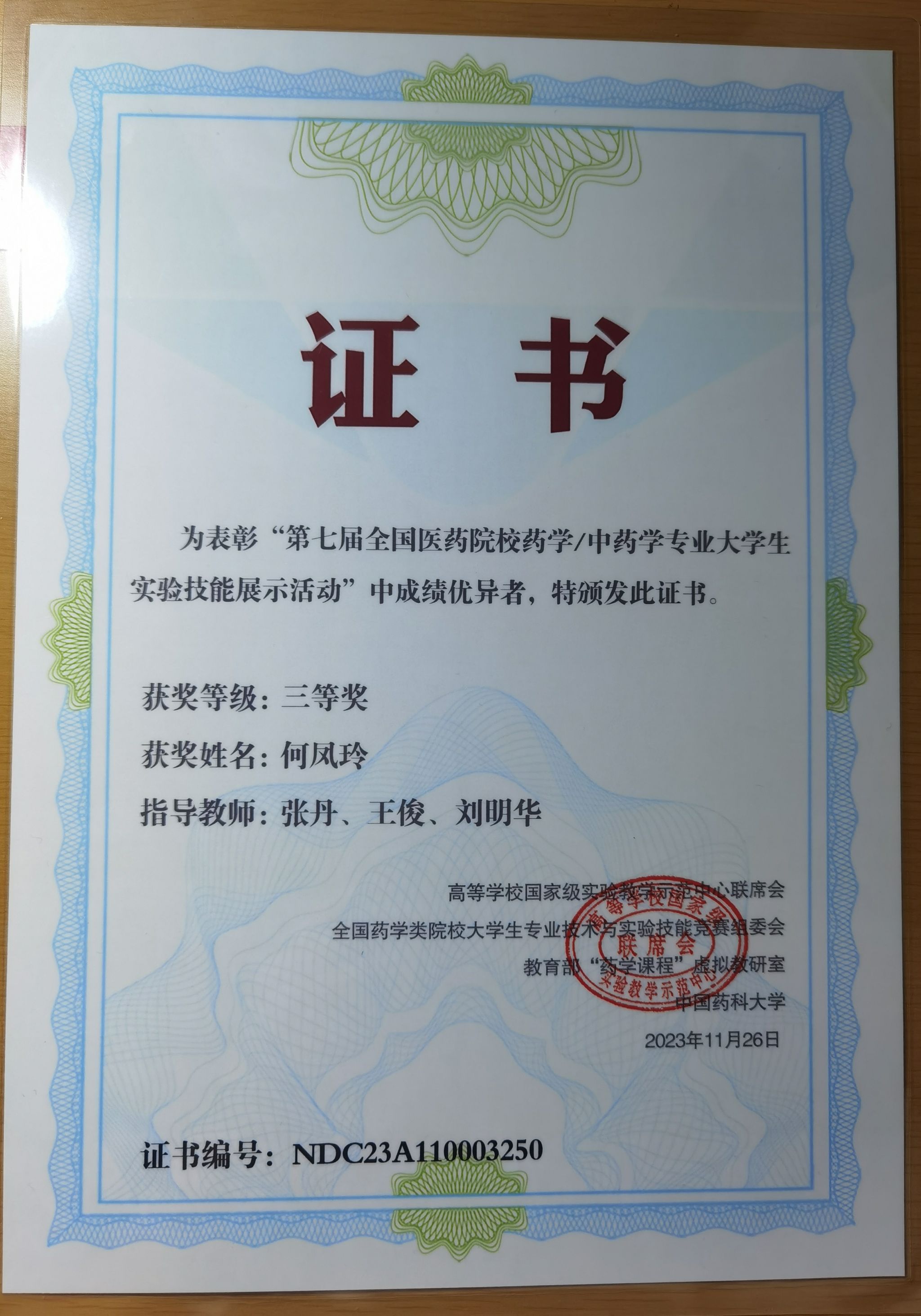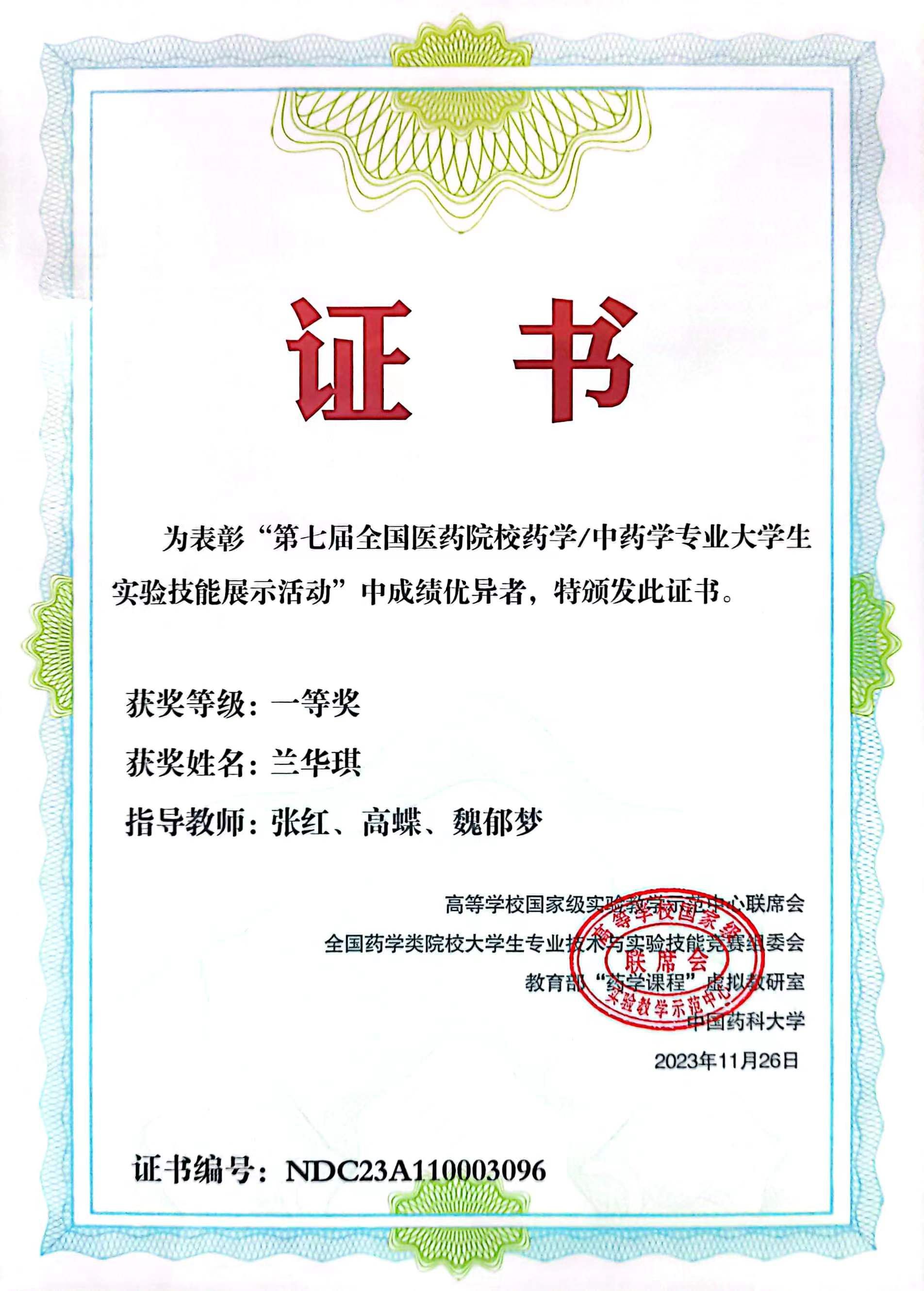为进一步加强药学和中药学专业实验教学,提高学生实验操作技能和实践动手能力,推动我国药学和中药学专业人才培养模式改革创新,11月24日-26日,由教育部高等学校国家级实验教学示范中心联席会、全国药学类院校大学生专业技术与实验技能竞赛组委会、教育部“药学课程”虚拟教研室和中国药科大学共同举办的“第七届全国医药院校药学/中药学专业大学生实验技能展示活动”在贵州遵义医科大学召开。我校药学院2020级临床药学2班兰华琪荣获一等奖,2020级中药学1班何凤玲荣获三等奖,创我校参加此赛事以来历史最佳成绩,充分展现了我校药学院学生扎实的理论水平和动手操作能力。